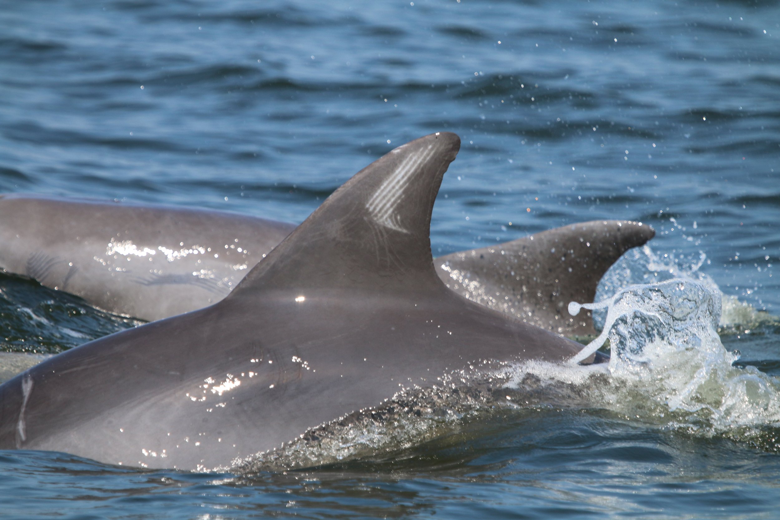 Every PCDP photograph tells a story. The unique dorsal fins we capture tell us who's there, and their size and skin conditions can tell us even more about them. Photograph provided by the Potomac-Chesapeake Dolphin Project, taken under NMFS permit no. 19403